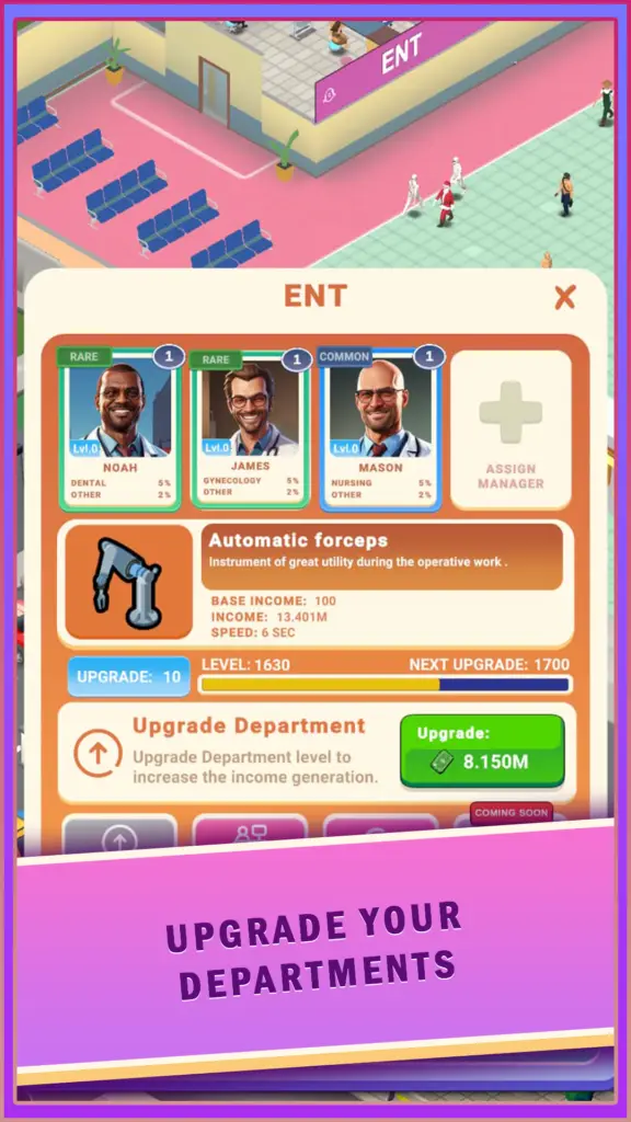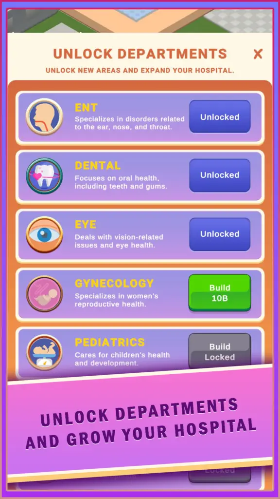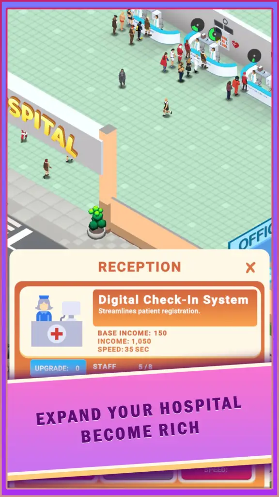 Learn from your own experience and become one of the world’s most well-known idle hospital managers! Upgrade the hospital areas, address your patients’ demands, and provide the greatest medical help available!